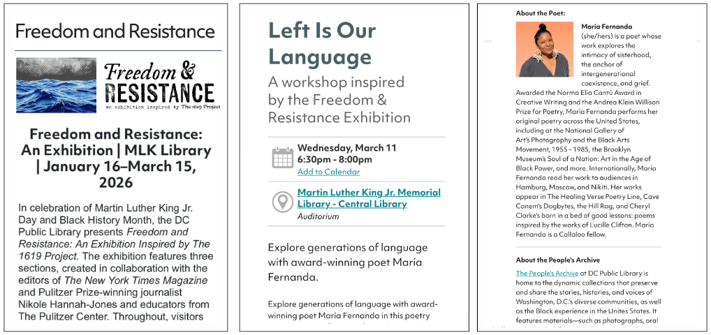 María Fernanda is an award-winning poet. Her works explore the intimacy of sisterhood, the anchor of intergenerational coexistence, and grief. She performs, delivers speeches, experiments with visual poetics, and more. In 2026, she presented on her independent research in Spain and, upcoming, on The 1619 Project: A Visual Experience at the DC Public Library’s MLK Jr. Memorial Library.
