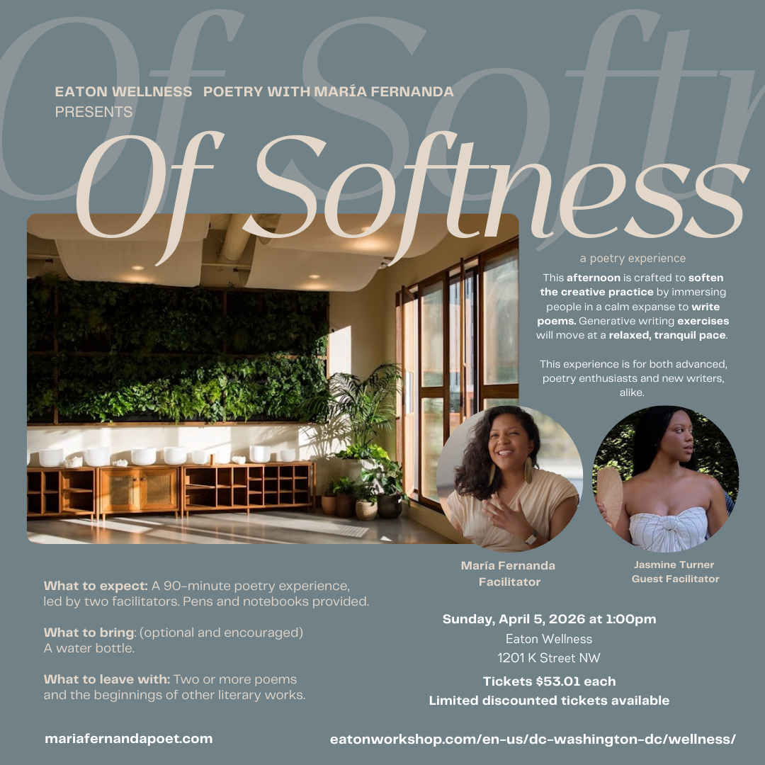 Soften your creative practice and immerse yourself in a calm expanse to write poems. This is a monthly Sunday series with award-winning poet María Fernanda, beginning April and closing in June at Eaton Wellness, on the second floor of the Eaton Hotel. Each session will highlight an element of wellness and feature a guest facilitator.